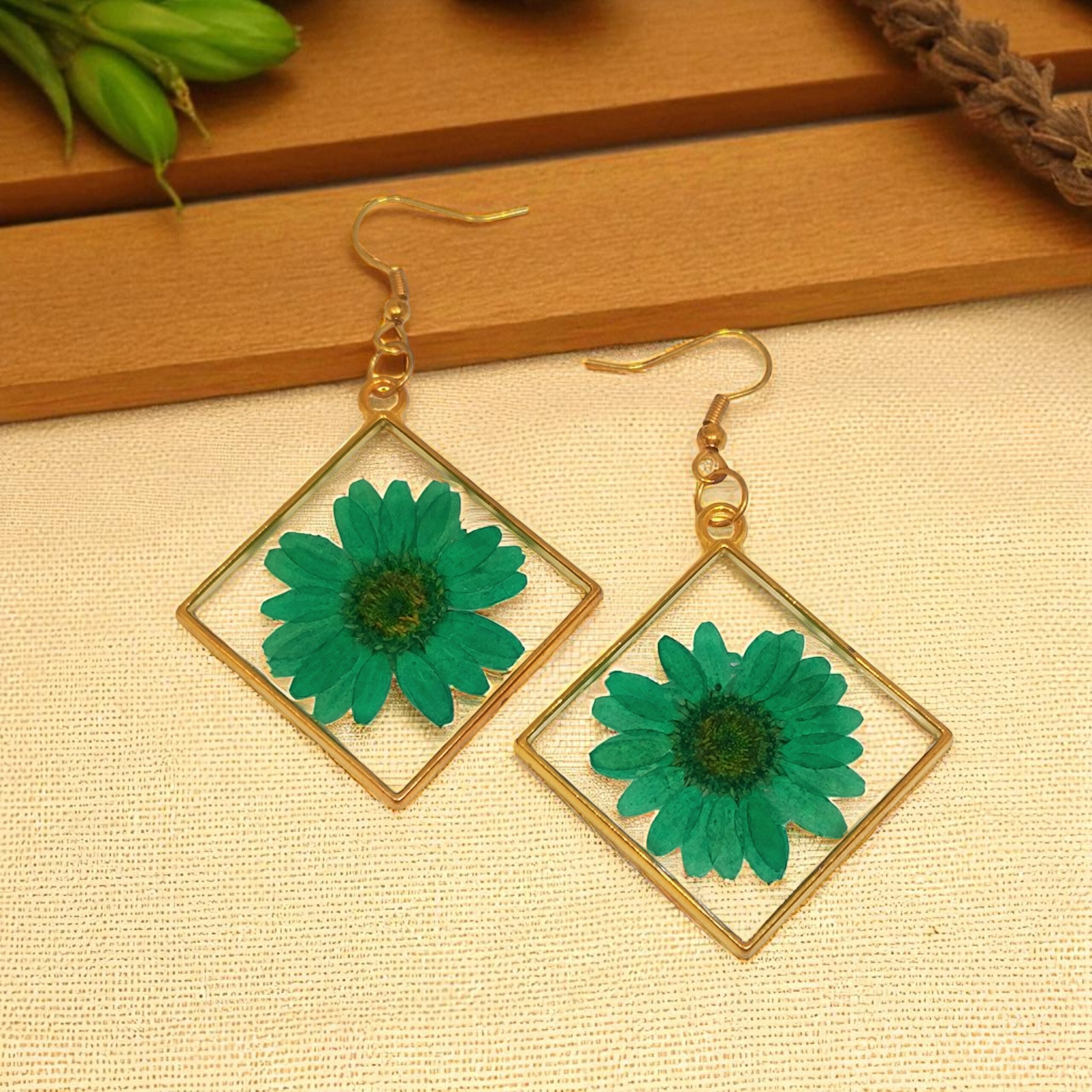 The Floral Resin Bezel Earrings blend artistry and nature in a unique way. Each piece is handcrafted, ensuring that every earring is one-of-a-kind. The vibrant green flowers are carefully preserved in high-quality resin, maintaining their beauty and freshness. The bezel setting securely holds the floral design, offering both durability and elegance. Our artisans pay meticulous attention to detail, crafting earrings that are not just accessories, but wearable pieces of art.